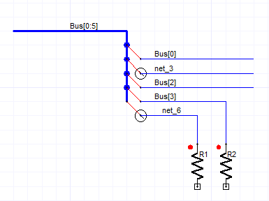 The figure above shows a bus named Bus[0:5], which has five nets that are branched out through bus entry objects. Three nets are named properly as: Bus[0], Bus[2] and Bus [3]. However two nets: net_3 and net_6 are not connected to the bus by name - and thus are shown drawn with circular disconnect objects.