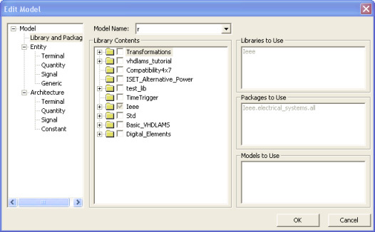 To include libraries, packages, and models in a VHDL model, select Edit Libraries and Packages in the VHDL Model Editor menu. The Edit Model dialog box appears: