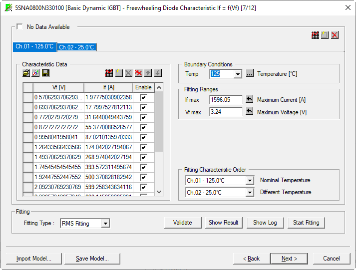 - In the Fitting Characteristic Order section, you must specify two sets of characteristic data. The characteristic under nominal junction temperature is mandatory, while the characteristic at a different temperature is used to calculate correction coefficients when the junction temperature of the device is different from the nominal temperature. If the data for the latter are not available, select Not Used from the drop-down list.