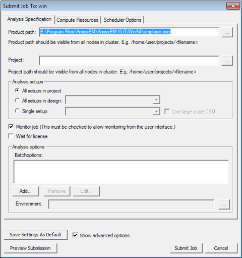 - Analysis Specification – Specify the project name, the setups, and analysis options such as batchoptions. If Show advanced options is selected, environment variables can also be added. The project file path name must be a UNC path that is accessible from each compute host used for Ansys Electromagnetics jobs.