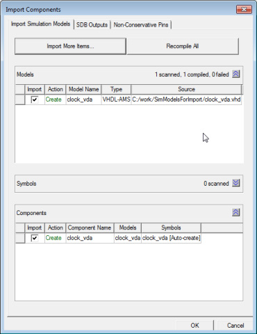 - The Import Simulation Models tab Models area lists the models that can be imported, provides an Import check box, lists the model Type (SML, VHDL, and so on), and the Source path. If a model already exists, the Action field indicates that the model will be updated; while for new models, it indicates that a model will be created.