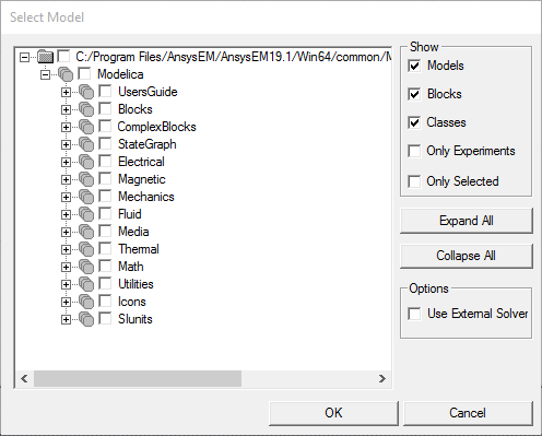 Note:For a Modelica import, a Select Model dialog box appears showing the models, blocks, and classes contained in the selected model or package file. It shows the complete package hierarchy if the selected file is from the library. Review the package hierarchy and choose the desired model, block, or class.