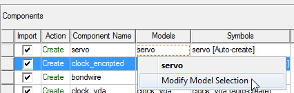 - Similarly, the Components area lists the components available for Import by name. If a component already exists, the Action field indicates that the component will be updated; for new components, it indicates that a component will be created. It also provides a button for choosing a Symbol for the component from the symbol library; and a button for choosing a Model for the component. The buttons display the names of the model and symbol currently associated with the component.