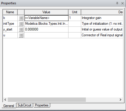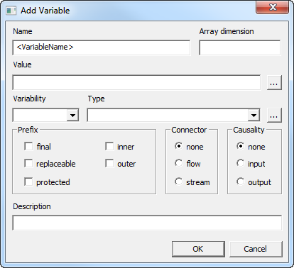 Create a variable in Modelica by editing the value in a component's parameters Properties dialog box.