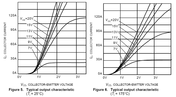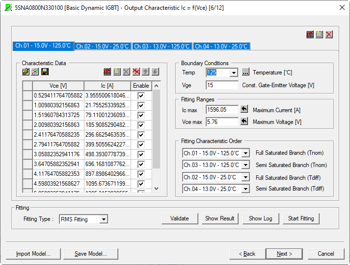 The Full Saturated Branch output characteristic under nominal junction temperature is mandatory, while the characteristic at a different temperature is used to calculate correction coefficients when the junction temperature of the device is different from the nominal temperature. If the data is available, use the value of the gate voltage which corresponds to the one used in the on-switch switching measurements (Vge on from the Nominal Working Point Values dialog box).