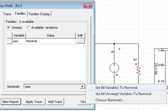 [error] Report 'XY Plot 1' trace 'E1.I': please set all variables to nominal in Families tab.