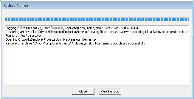 A full log file is also generated which contains detailed information about the restore process. The first line in the text window displays the location of the full log file. After the restore has been completed, click View Full Log to display a detailed log of the restoration.