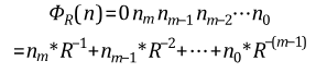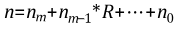 For example, consider the integer 687459, which can be represented this way as n0=6, n1=8, and so on. Because this integer is represented with radix 10, you can write it as 687459=9+5*10+4*100 and so on. In general, for a radix R representation, the equation is: