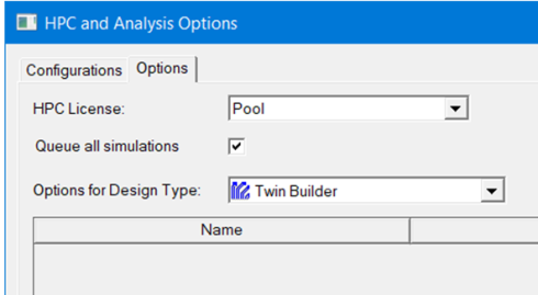 To set the HPC and analysis options, select Tools > Options > HPC and Analysis Options. The HPC and Analysis Options dialog box appears, displaying two tabs: Configurations and Options.