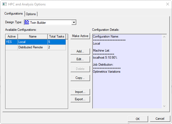 Define configurations for the Twin Builder design type. The Active configuration is used when solving an analysis for the design type.