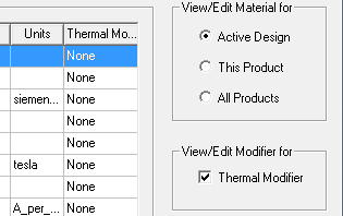 Edit Material dialog box, select the Thermal Modifier check box. The Thermal Modifier column appears in the Properties of the Material area.