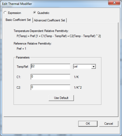 - Select the Quadratic radio button and click the Basic Coefficient tab. You can edit fields for the TempRef and units, and fields for C1 and C2 with this equation: