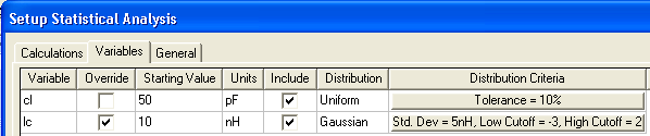 The low and high cutoff values multiply the Gaussian Standard Deviation value. In the image below, the lc variable uses a Gaussian distribution that extends three standard deviations below 10nH and two standard deviations above 10nH. Outside these values, the Gaussian distribution is truncated, effectively giving a Gaussian distribution on a pedestal.