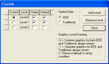 - Levels greater than 1 are independent for each style. Click Add Level to add any number of levels, for IEEE, Traditional, or both styles. Visibility of graphics on additional levels may be controlled with the Default check box in the Levels dialog box, in a special component dialog box, or programmatically. In Twin Builder, you can control visibility by setting up Boolean conditions using quantities, then evaluating the conditions as a simulation progresses.