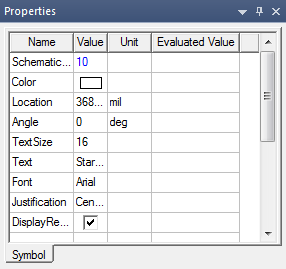 The Symbol tab provides information on a number of modifiable attributes of component symbols, displayed component properties, and primitive drawing elements displayed in the schematic.