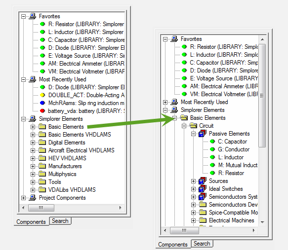 Use the Components tab in the Component Libraries window to browse and select schematic components from the available elements libraries. A typical Components tab is shown below. Your actual window contents will vary with the libraries installed. The installed libraries are listed alphabetically under Simplorer Elements in hierarchical folders grouped by component function. For example, the Basic Elements library expands into several categories and sub-categories as shown.