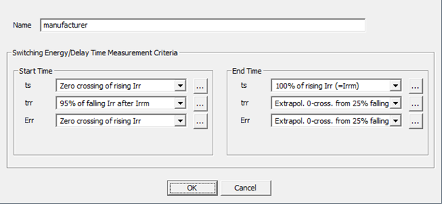 - Manufacturer Data – These are measurement criteria of dynamic characteristics defined by manufacturers. The information is usually found in the data sheet or device application note from the manufacturer. The documentation describes specific settings for several manufacturers. These are the measurement