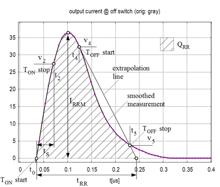 The most important setting in this dialog box is trr. It always starts at the current zero crossing point, while the end point is extrapolated on two helping points, t4 and t5 , as in the following figure. Enter t4 in the first input box next to trr and t5 in the second, according to the vendor’s specification. Qrr uses the same start and end time as trr.