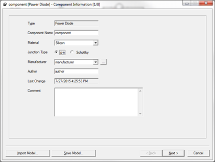 - In the Component Information [1/8] dialog box, enter the component name, material, and junction type and define the manufacturer data.