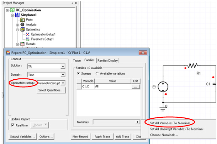 - You can see each trace (overwriting the previous) by setting the Optimetrics setup in the Report dialog box to None in addition to having all variables set to Nominal. At the end of the analysis, you will see the last calculated value.