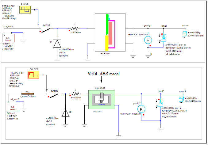 Twin Builder allows the use of finite element data generated from a Maxwell circuit simulation through the ECE (Equivalent Circuit Export) link. In this example, two solenoid models are simulated. The first model uses finite element data from the ECE link (Maxwell model) and the second uses an approximated model developed using VHDL-AMS (VHDL-AMS model).