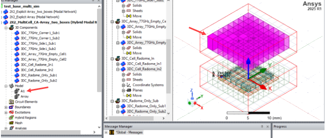 Each array must be enclosed by an airbox. If multiple arrays have different airboxes, each airbox must be assigned as FEBI. Multiple arrays can now have contact with lattice boundary faces.