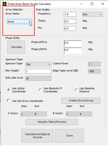 The Finite array beam angle calculator toolkit automatically calculates the edit source setting given aperture taper parameters and is very useful in array beam design. In 25.1 the feature extends to multiple array designs and each array can be calculated individually. When the Beta feature for Multiple Arrays is off, the new “Array Selection” control box still appears in the Toolkit, but only one array can be selected.