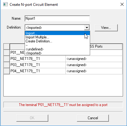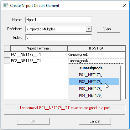 - Use the drop down menu for the HFSS Port rows to make terminal assignments. The View... button allows you to use Network Data Explorer for the selected Touchstone file.