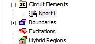 - You can OK the dialog box, and see the Circuit Element listed in the Project tree and the Ports you selected are removed from the Excitations list.