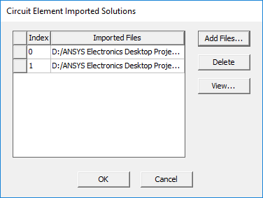 Click Add Files... to open a browser to add suitable Touchstone models. When you have added the models they are listed as Imported Files and you can OK the browser. The View... button opens the selected file in Network Data Explorer. Note: Each file you select has an Index assigned here that you can use to identify which file to use for the Circuit Element.