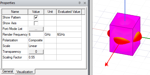 If you have previously solved the source design, and correctly assigned valid phase centers, you can check Show Pattern, and see additional display properties. The antenna pattern is computed and displayed in the bounding box in the Model window.