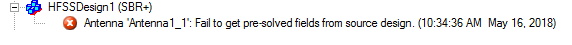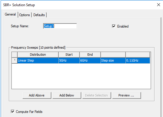 Once you have configured the SBR+ design with an Linked Antenna, you set up a model object and Solution Setup. The simulation frequencies in target design must fall in the range of the source design frequencies. Below is an example of source design setting and target design setting, using compatible frequencies. and Save Far fields so that Gain can be plotted.