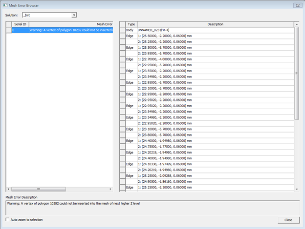 For each Mesh Error, a brief description is provided. When a given error is selected in the window, details and dimensional attributes for the contributing bodies are displayed. When one or more Type entities are selected, a graphical overlay are displayed in the Layout view to better visualize the feedback.