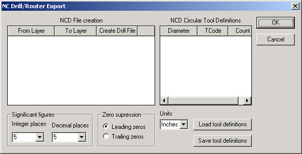 To export layout data, on the File menu, select Export > NC Drill to open an explorer window. Selecting NC Drill File opens the NC Drill/Router Export window.