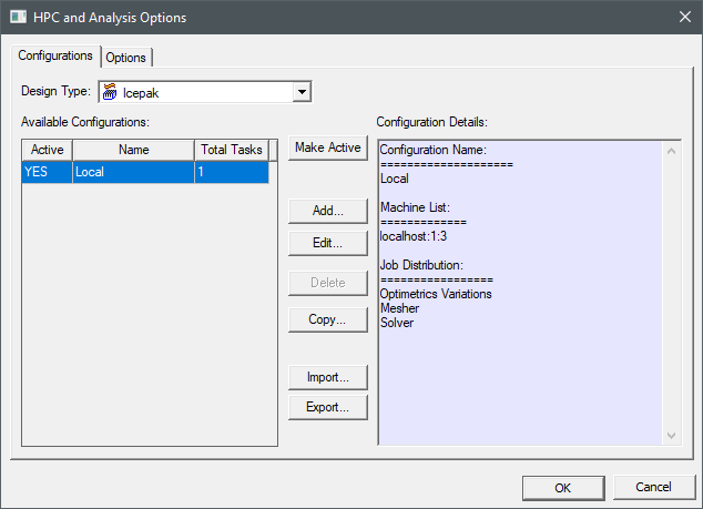 The distribution types that you enable here are listed in the HPC and Analysis Options dialog box in the Configuration Details section. To access this dialog box, click Tools > Options > HPC and Analysis Options from the menu bar or click the HPC and Analysis Options command on the Simulation ribbon tab.