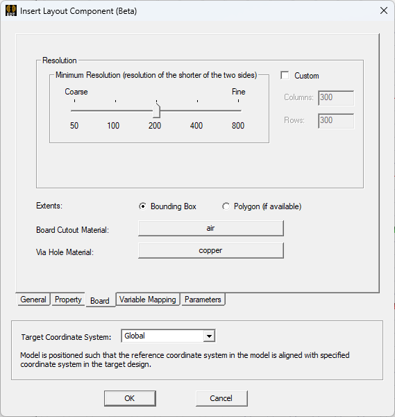 Board Cutout Material specifies the material assigned to the board cutout geometry, if it exists. Board cutout geometry exists if Polygon is selected for Extents, and that polygon contains void polygon(s). The cutout geometries are created from those void polygon(s). The default board cutout material is that of the global mesh region if present in the model. Otherwise, the default board cutout material is set to air-solid.