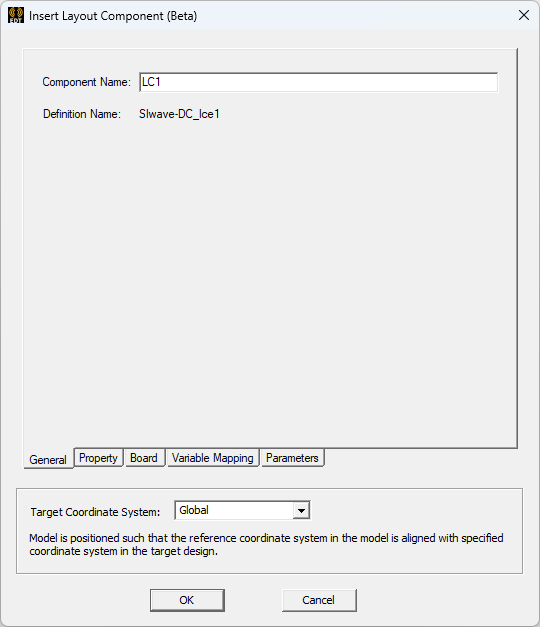 The General tab page allows you to specify a target coordinate system. From the Target Coordinate System drop-down list, select the coordinate system on which to place the layout component. Relative coordinate systems defined in the target design appear in the drop-down list.