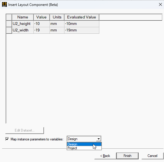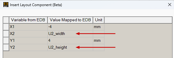 - Optionally, you can substitute local variable names for the numeric values in the Values Mapped to EDB column. This is particularly useful if you wish to include multiple instances of the layout component in a single design and have geometry variations between the instances. See Instance Variation for more information.