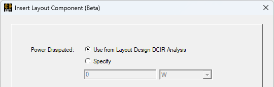 - On the Property tab, select an option to define the Power Dissipated. Power dissipated specifies the total power dissipated by the layout component.