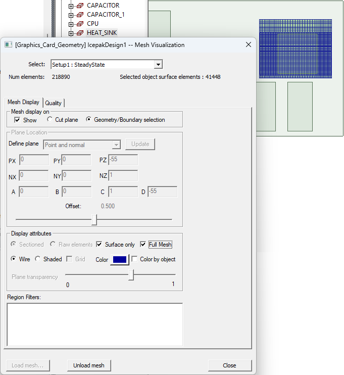 | Geometry/Boundary selection | Geometry/Boundary selection displays the mesh on object geometry selected in the 3D Modeler window or history tree or a thermal boundary condition selected in the Project Manager. When selecting geometry in the 3D Modeler window, you can select and display mesh on objects or faces. |