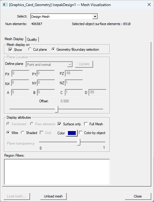 - In the Mesh Visualization dialog box under Mesh display on, select Show and then Cut plane or Geometry/Boundary selection.Note: