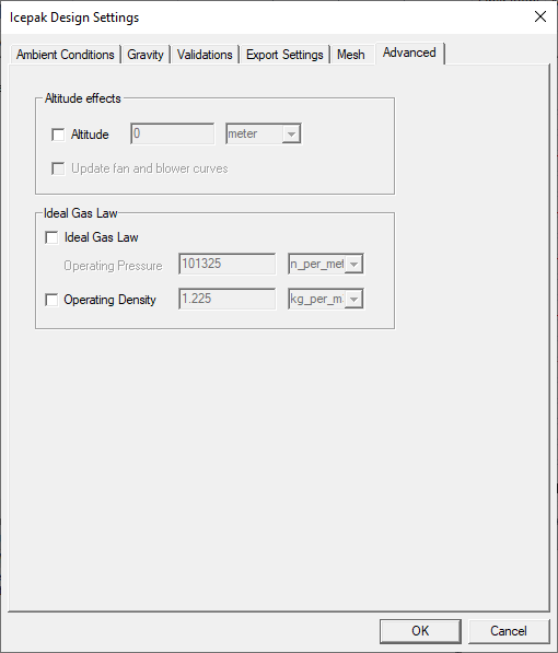 Select Altitude option and specify the altitude and unit. Icepak computes the density of air at a particular altitude based on the International Standard Atmosphere, ISO 2533:1975 published by the International Organization for Standardization (ISO).