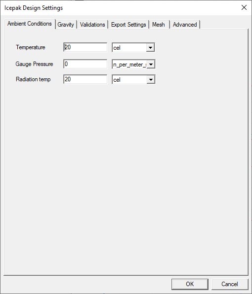 The Ambient Conditions tab allows you to specify the default ambient values for Temperature, Gauge Pressure, and Radiation temperature.