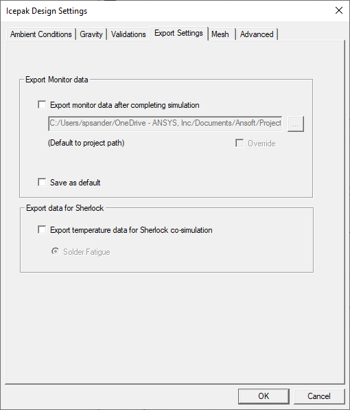 Under Export data for Sherlock, enable Export temperature data for Sherlock co-simulation to automatically generate temperature data files for use in Ansys Sherlock. By default, the directory "projectname.aedtexport" is created in the project directory (the location where the .aedt project file and folder are saved). The file path is displayed in the Message Manager.