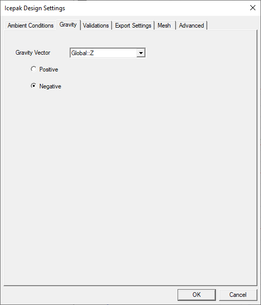 When including the effect of gravity for a natural convection simulation, select the appropriate coordinate direction from the Gravity Vector drop-down menu. Also, select Positive or Negative to select in which direction to apply the gravitational acceleration. The gravitational acceleration in Ansys Icepak is 9.80665 m/s2 in the selected coordinate direction.