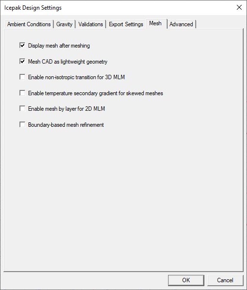 The Mesh tab allows you to enable meshing options for Icepak designs.
