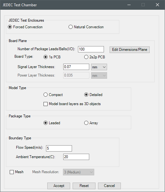 | Accept, Reset, Cancel | Click Accept to create the test chamber. If you selected Mesh and Solve, the Electronics Desktop will generate a mesh and analyze the design, respectively. Click Reset to restore the default values. Click Cancel to close the dialog box without creating the test chamber. |