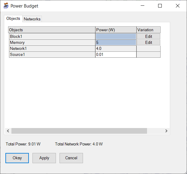 The Objects tabs shows all boundary conditions with a power assignment, including the sum of all network power assignments. The Networks tab displays only network boundary conditions with power assignments. |