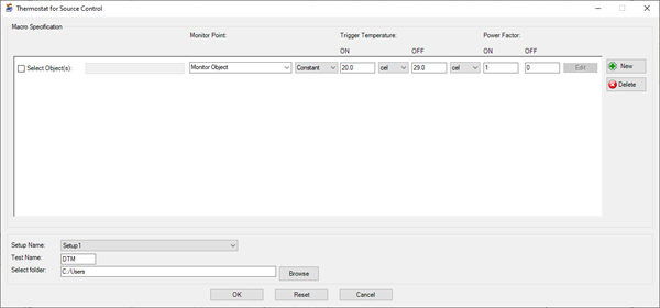 | Power Factor | Under Power Factor, enter the ON and OFF power factors to be applied to the selected objects' power when the objects' temperature is between the specified trigger temperatures. |