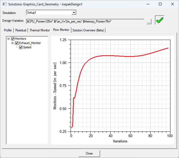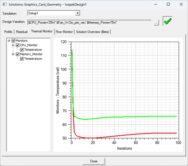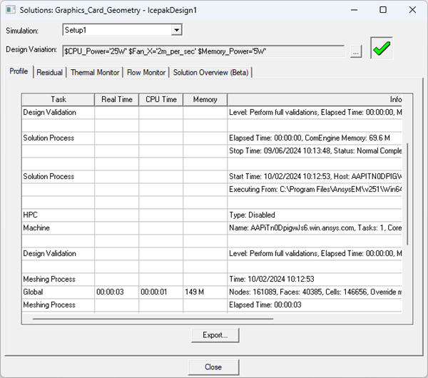 - In the Solutions dialog box, toggle between the Profile, Residual, Thermal Monitor, Flow Monitor, and Solution Overview (beta) tabs to view the information. See Solution Overview (Beta) for details on the data displayed on the Thermal, Flow, and Fan tabs.